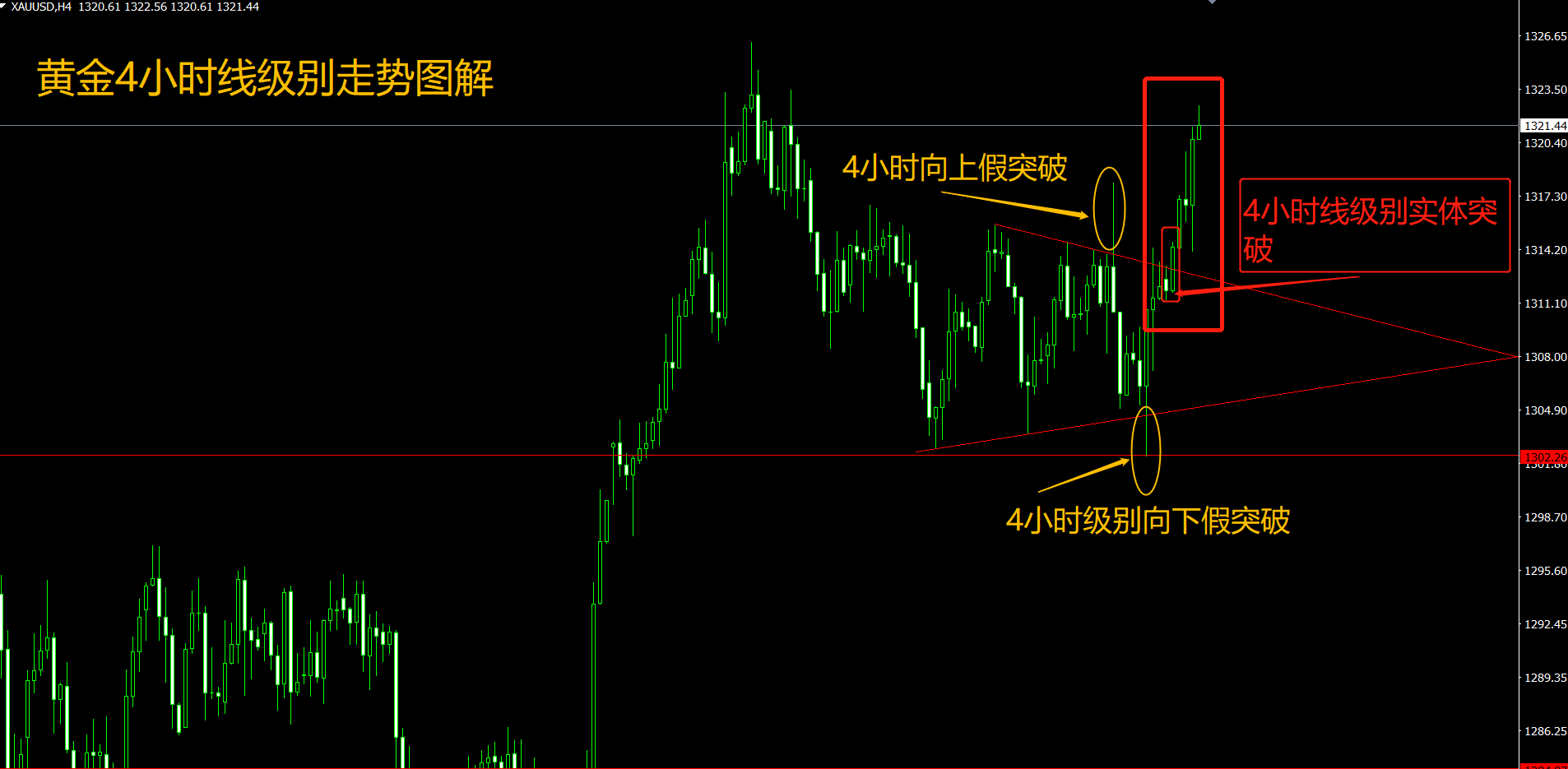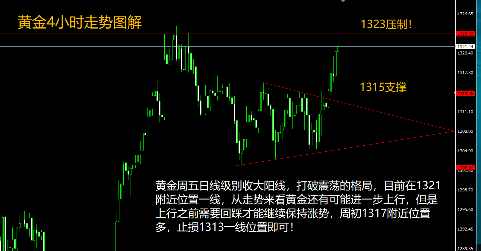 首先我们来看一下黄金,最近和不少交易者交易换了意见,在给出投资建议的时候,附上图形更加容易懂,这样直观的看到了支撑*的位置,同时也能很好的了解当日行情会有一个怎样的波动,下面我们来看一下黄金,周五,黄金以大阳线收尾,在1314一线位置的*打破了后,继续上行,昨日也在聊天中和投资者提到黄金已经打破了三角契型整理,之前在1302的向下突破与1317的向上突破均是在4小时线级别以长引线收尾,系假的突破形态,但是昨天的不一样,4小时强有力的收阳线,下面图形是昨天给出的提示