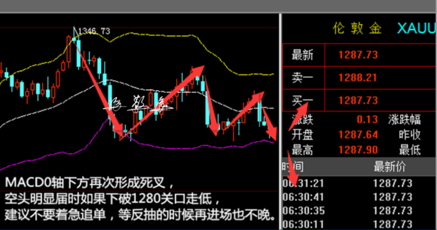 技术面上日线级别,KD死叉形成,MACD0轴下方再次形成死叉,空头明显,但是下方面临关键支撑位,需要有消息面刺激或者较强的空头技术面支持才能下破,届时如果下破1280关口走低,建议不要着急追单,等反抽的时候再进场也不晚。