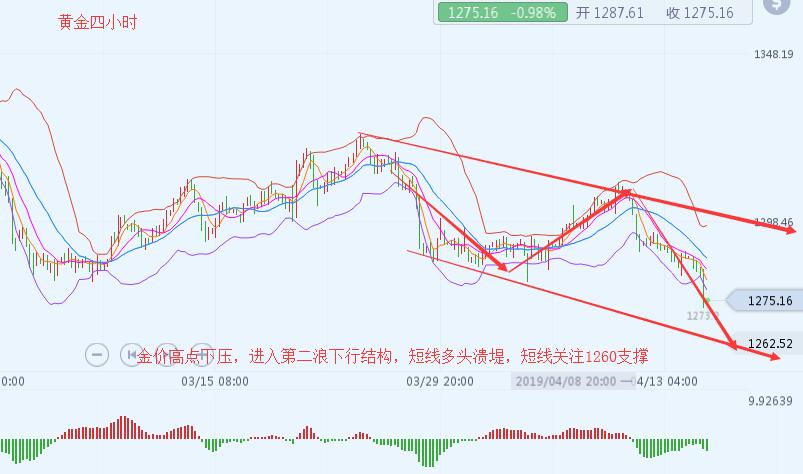 黄金短线四小时看来 ,金价当前已经突破1280下行支撑点位,后市多头已经完全溃堤,短线上金价下方的缺口依然是已经被打开了,下方后市支撑看来1260位置,当前金价在四小时的表现来看,进件依然空头已经占据上方风,当前已经是进入了下行第二浪性结构,而且近期金价多次下探1280分水岭,日内破位下行,后市金价进入空头时段第二浪下行结构关注1260位置支撑即可,加之当前金价boll强势下压,MACD指标绿色动能放量,MA5强势下穿MA10,明日金价有望继续走低,短线操作以反弹做空位置,下方防守位置暂定1260支撑,破位空头有望再行突破低点到达1210位置。
