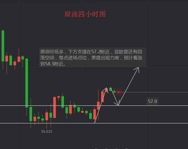 1、原油57.0-57.2附近做多,止损0.4个点,目标看58.0-58.2附近;