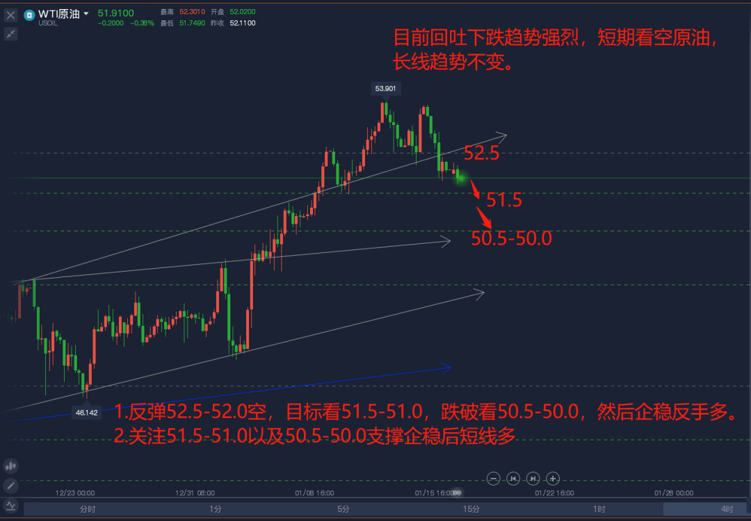 技术面上,日线收阳跌破53,今日开盘后继续阴跌,目前原油回撤下跌需求强烈,思路上短期继续做空,操作上反弹52.0-52.5空,目标看51.5-51.0,跌破看50.5-50.0,若企稳短线多,反之继续持有看新低。