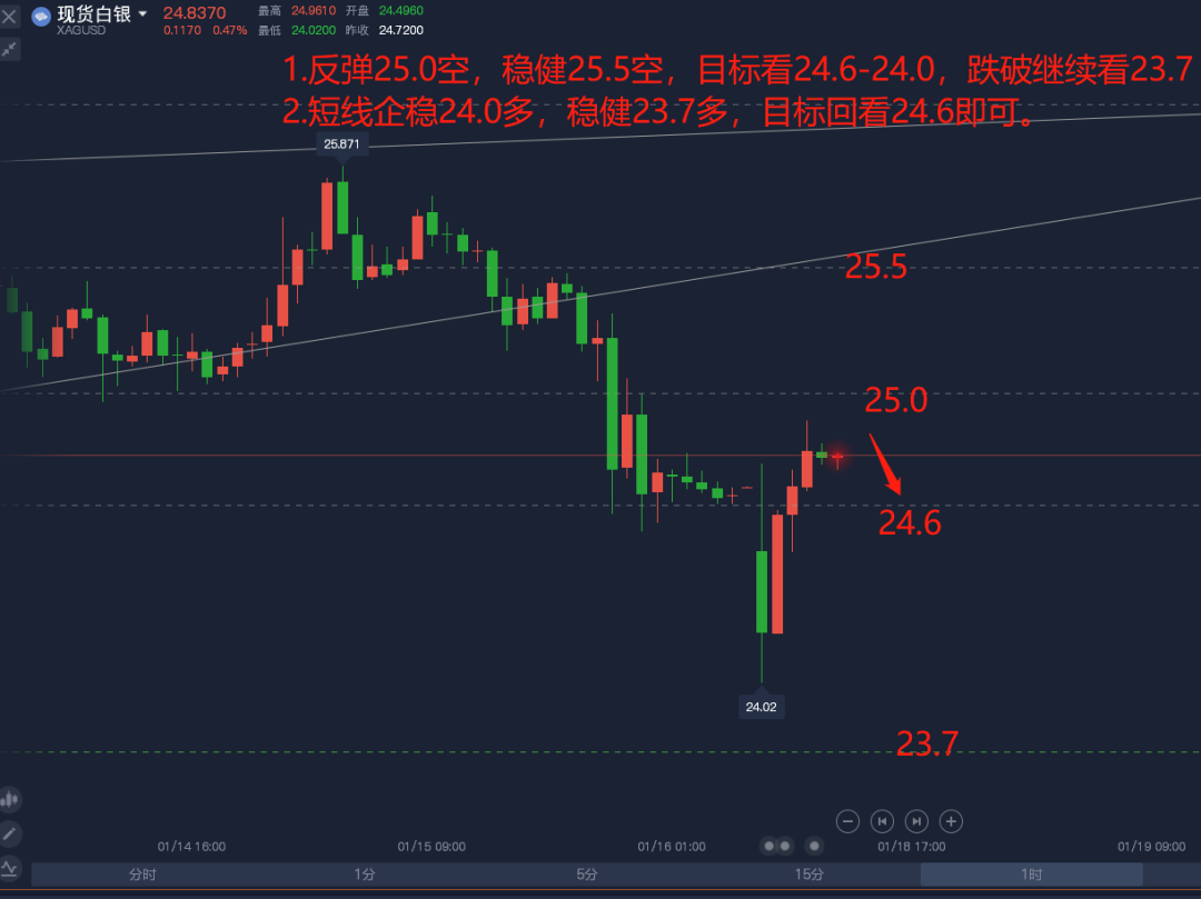 技术面上,日线收阴跌破25,当前思路上与黄金保持一致,主空,因此反弹25.0空,稳健25.5空,目标看24.6-24.0,跌破看23.7,短线关注24.0及23.6支撑参与反弹。【风险前瞻】