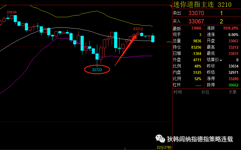 道指昨日给出32720附近做多,最低跌至32723位置,激进在32820已经进场,最高反弹33212位置,今日来看道指短线回落之后依旧是一个续涨形态,低位进场可以继续持有,没进场今日继续看涨不变,回落做多:激进可以根据实盘在32850-32880附近轻仓多,稳健依旧等待32680-32720做多,32530补多,止损32400,目标看33380减仓, 33630全部离场。