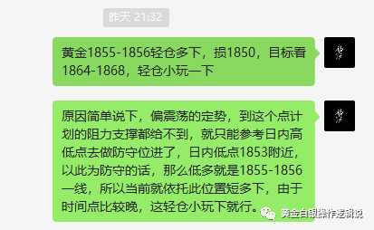 这种情况下,就只能寄望于欧盘的方向指引了,只是欧盘的表现也不尽人意,依然是小区间运行,这样美盘无疑是继续看震荡了,且计划支撑阻力都给不到,就只能参考当时日内高低点的防守,当时日内低点1853附近,高点1866附近,这样参考防守位去选择进场位置的话,那么低多大概就是1855-1856一线,高空则是1864-1865附近,最终是先行触及了下方的位置,则让1855-1856参与了一次多单。