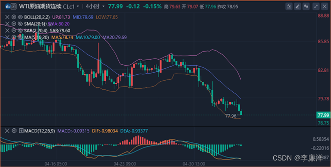 原油实时行情分析:根据周K盘面原油本周都是以下跌为主,最高点83.91,最低77.96,下跌5.67,幅度6.78%直逼开年以来7.44%,根据布林线周线来看原油走势都是以布林线中上轨运行,直至昨日非农影响,打破布林线中轨线78.42来到中下轨区域,周K盘面MACD指标红色动能柱也出现走弱现象,4小时盘面原油目前以布林线中下轨为主,甚至差点冲破下轨线77.67支撑,MACD指标绿色动能柱也开始慢慢增强,从以上面盘分析来看下周一李廉洋认为以4小时布林线上轨81.73为一线阻力,下方77.67为一线支撑。