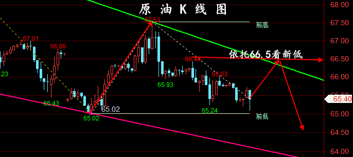 技术面:昨日国际油价多空维持窄幅震荡区间。亚欧盘时段,原油价格小幅反抽,盘中承压66.4关口*回落走跌,午后欧盘以及晚间美盘进一步下行,刺破65.2关口后迎来反抽弱势收盘,日K线报收*回落中阴。顺应当下空头动能,以及主次交替规律,日线级别预计还有进一步下行回落预期。晚间重点关注上方66.4阻力,下方64.0支撑!个人预计:高空为主,低多为辅;WTI分水岭:65.0美元/桶!