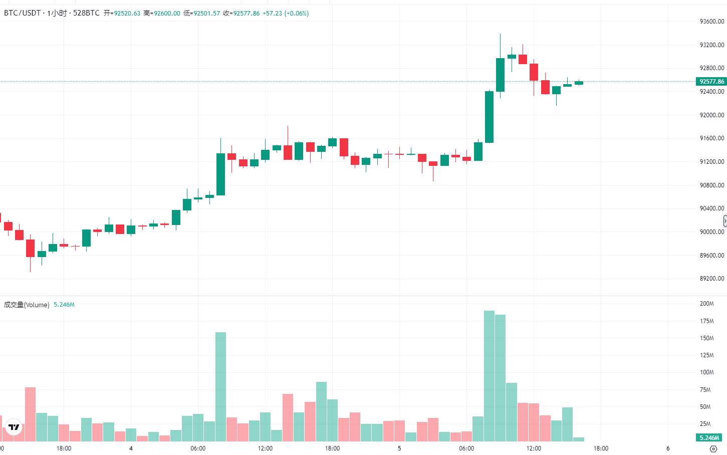 比特币:冲高至 93600 附近(前期密集成交的阻力区)后,抛压明显放大(冲高时段成交量陡增),当前在 92500 附近震荡,短期支撑看 92000,若跌破可能回踩 91500;